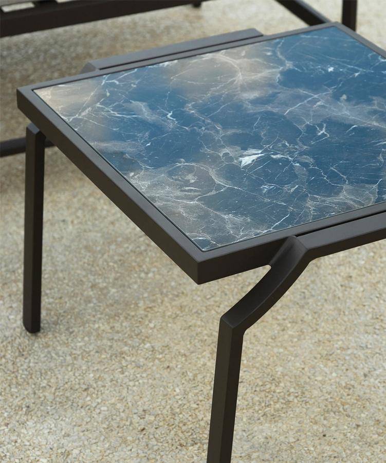 Side table with metal frame, available in a range of finishes. HPL top. Suitable for exterior use.