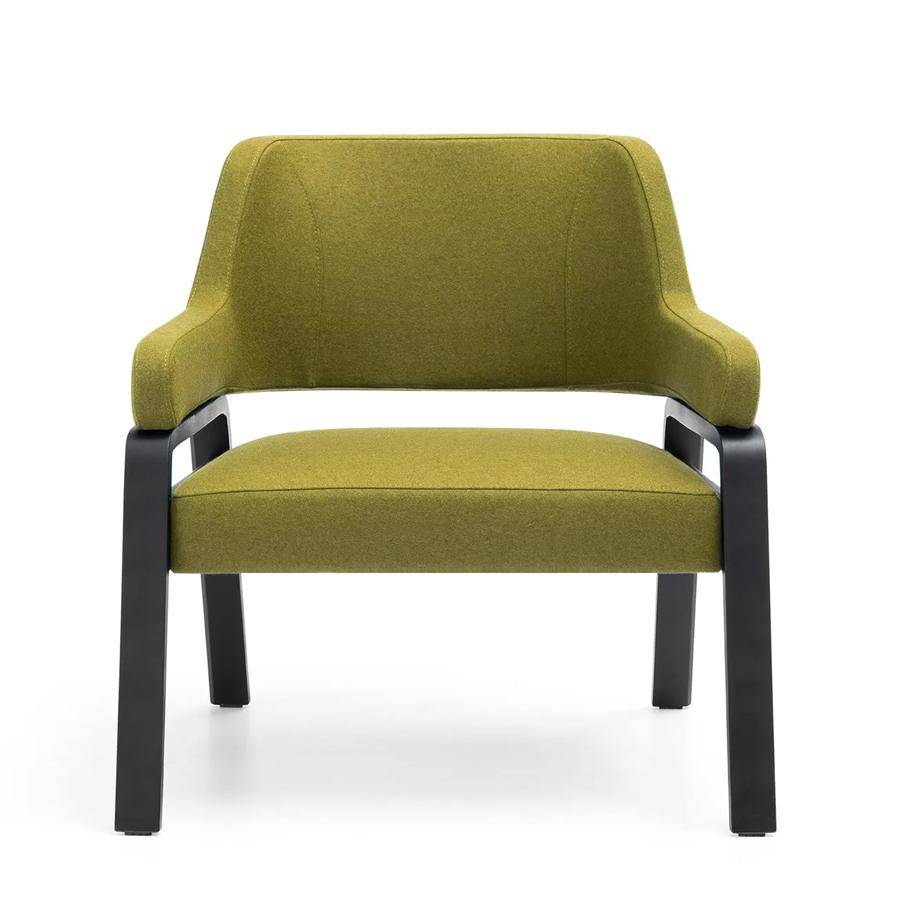 Sophisticated lounge chair with wooden frame that supports backrest. Upholstered seat and back.