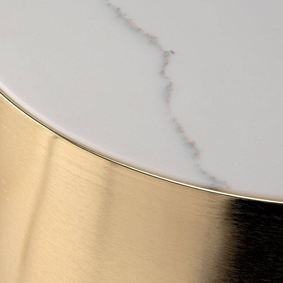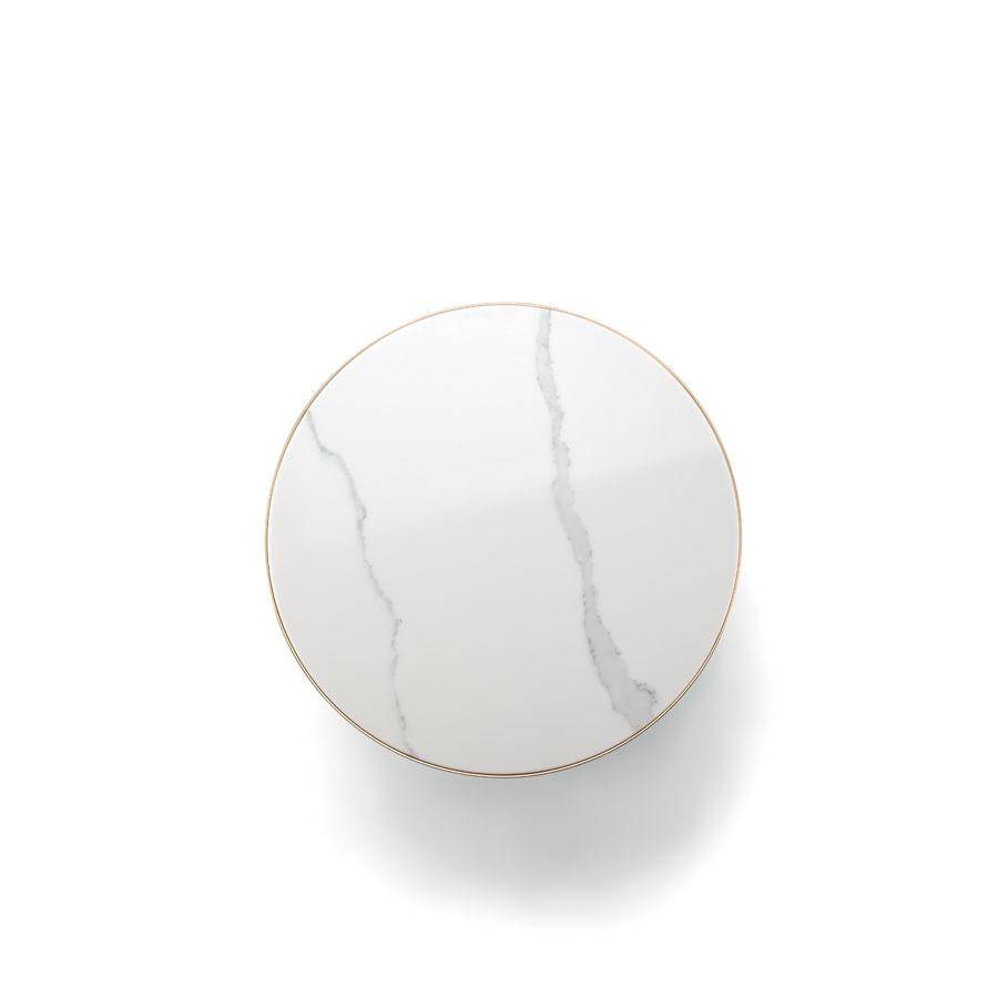 Metal side table, available in round or rectangular shape. Stained to brass. Carrara marble top with no stain treatment.