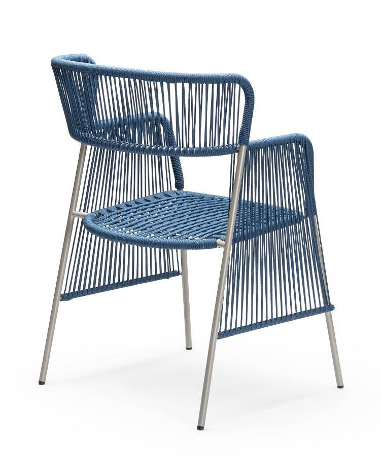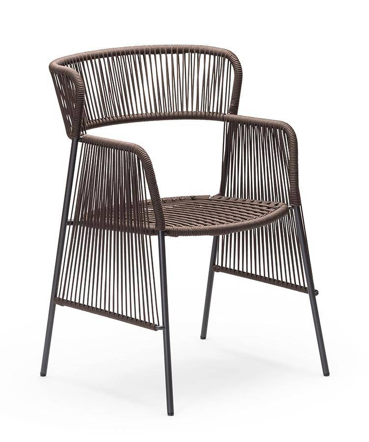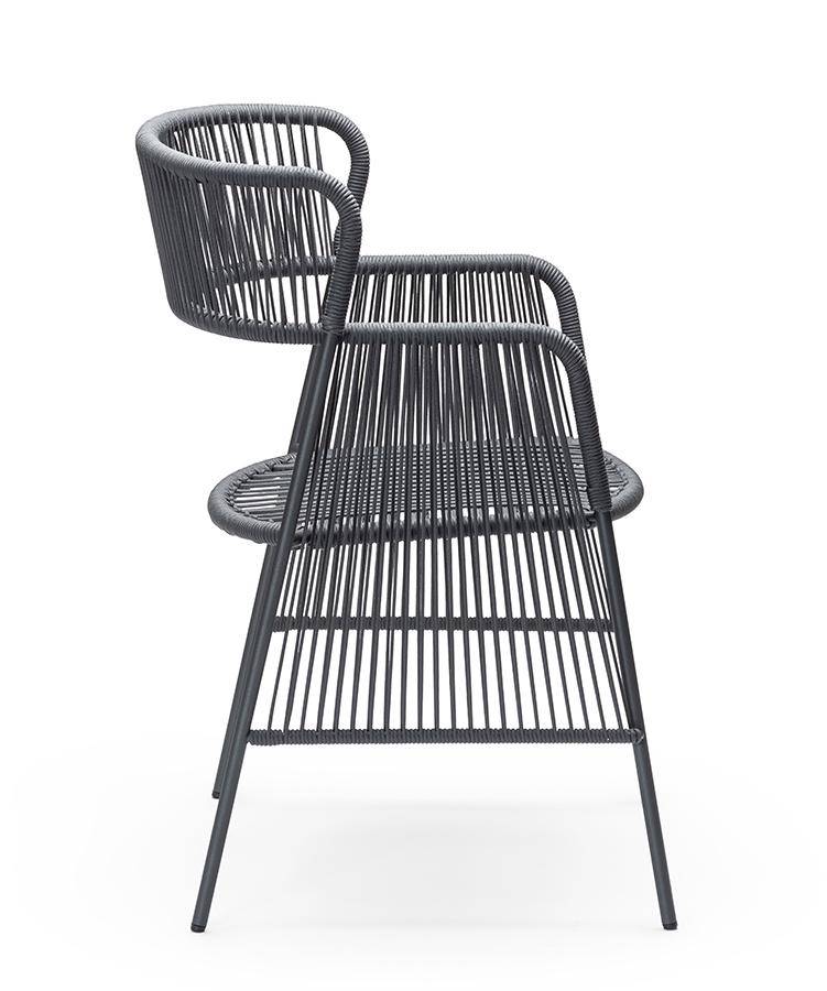 High back armchair with powder-coated metal frame covered in handwoven marine rope. Suitable for exterior use.