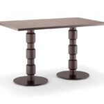 Timber pedestal dining table. Base in solid beech wood, available in a various stained finishes. Metal base plate in black powder coated finish. Top available in laminate, veneer and solid timber.