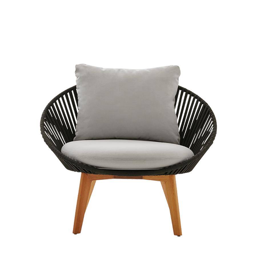Contemporary lounge armchair made with a powder coated metal structure, covered with stylish handwoven polyester rope. Upholstered seat and back cushions for added comfort.