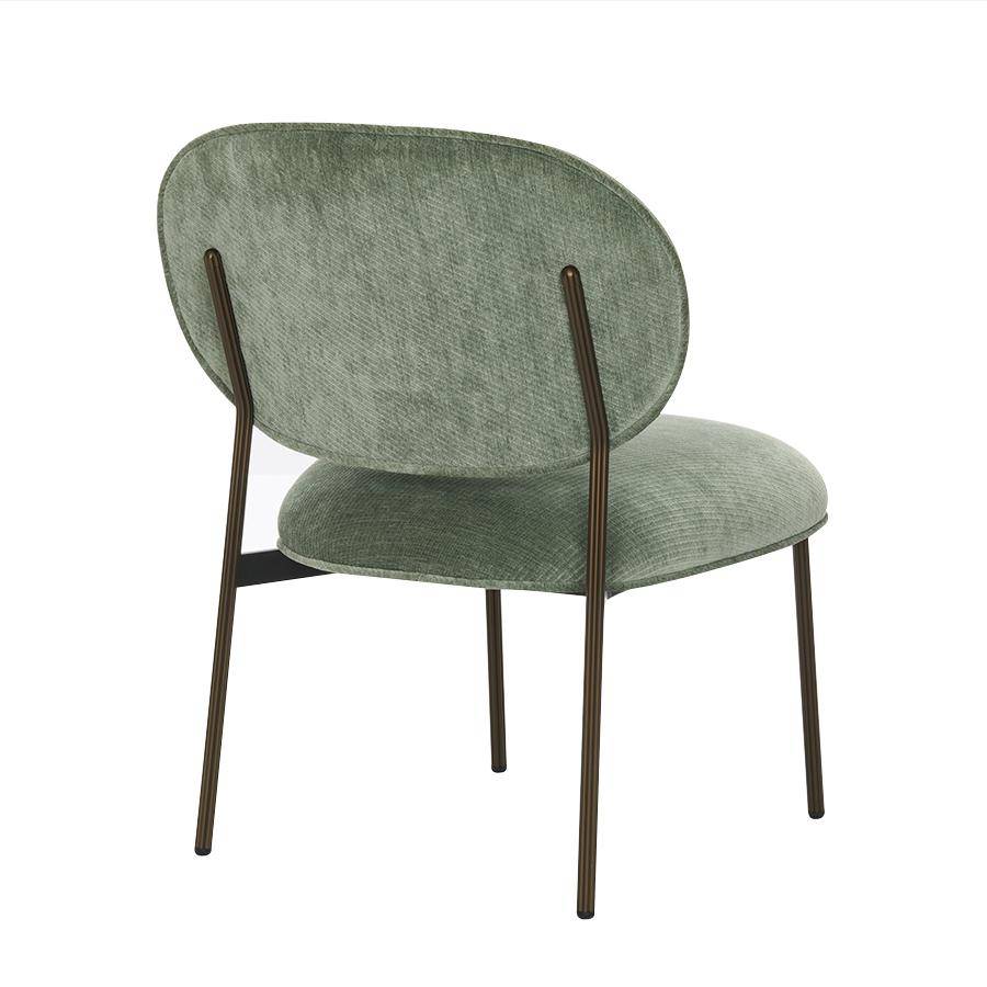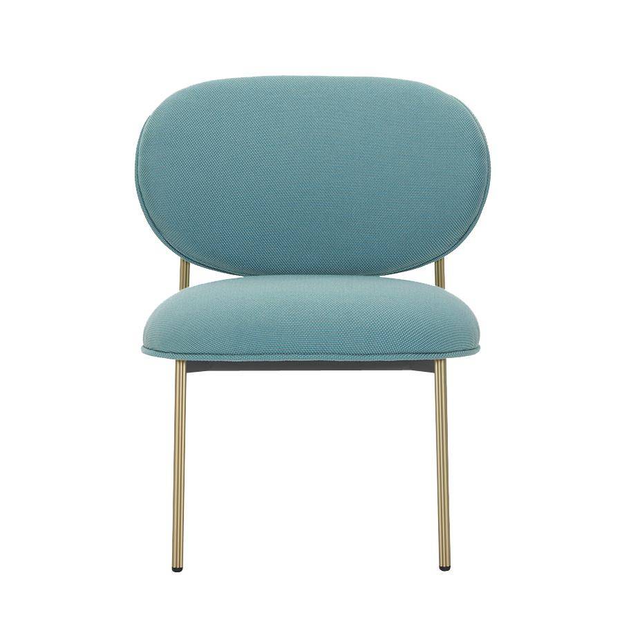 Lounge chair with slender aluminium frame available in a range of finishes. Soft and inviting flower shaped profile, upholstered in fabric, leather or faux leather.