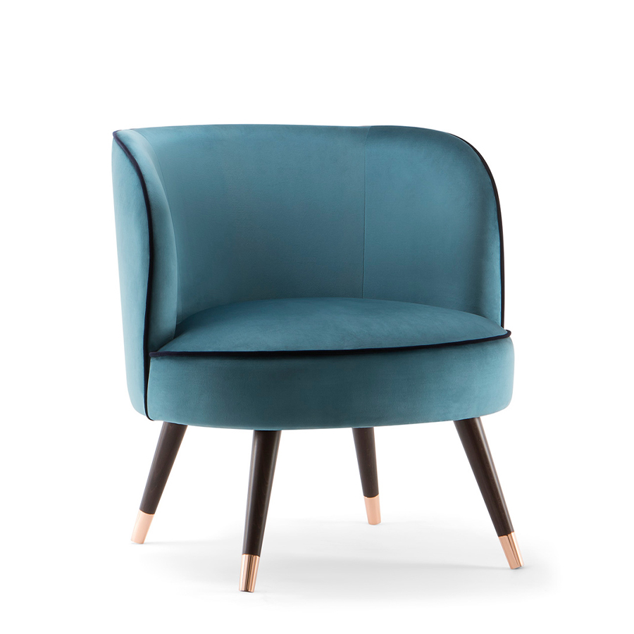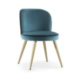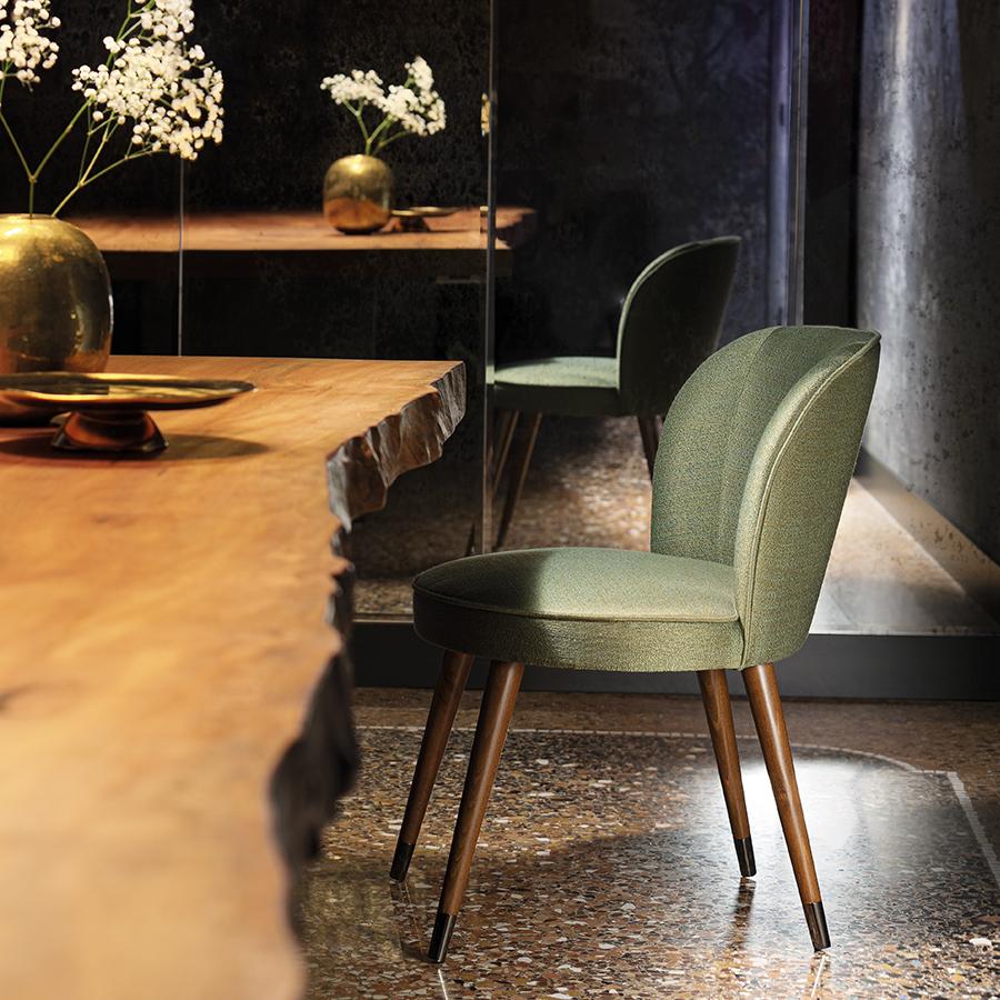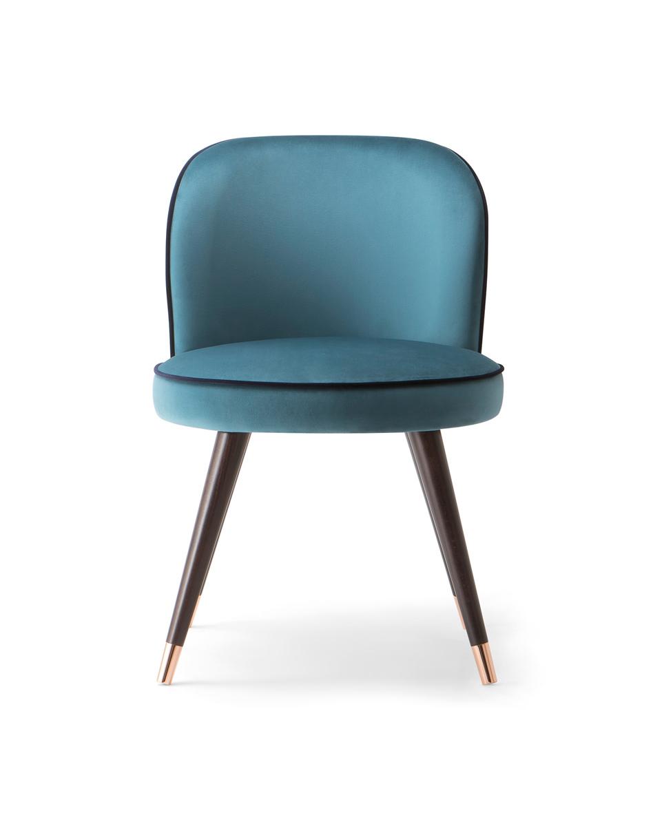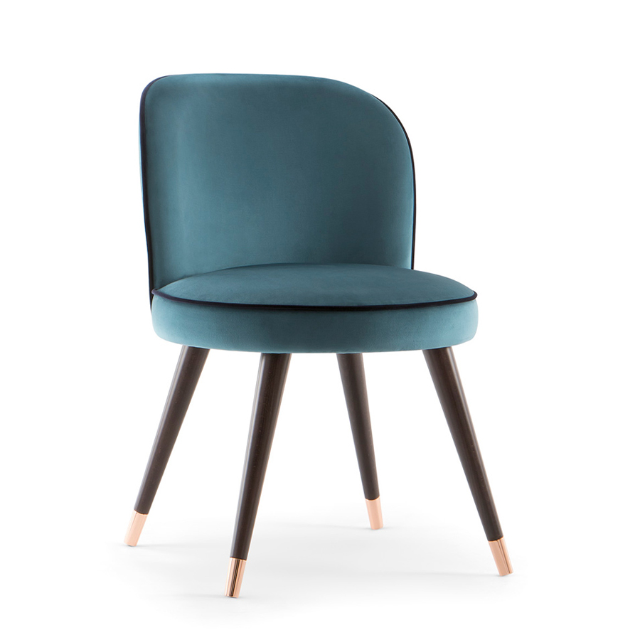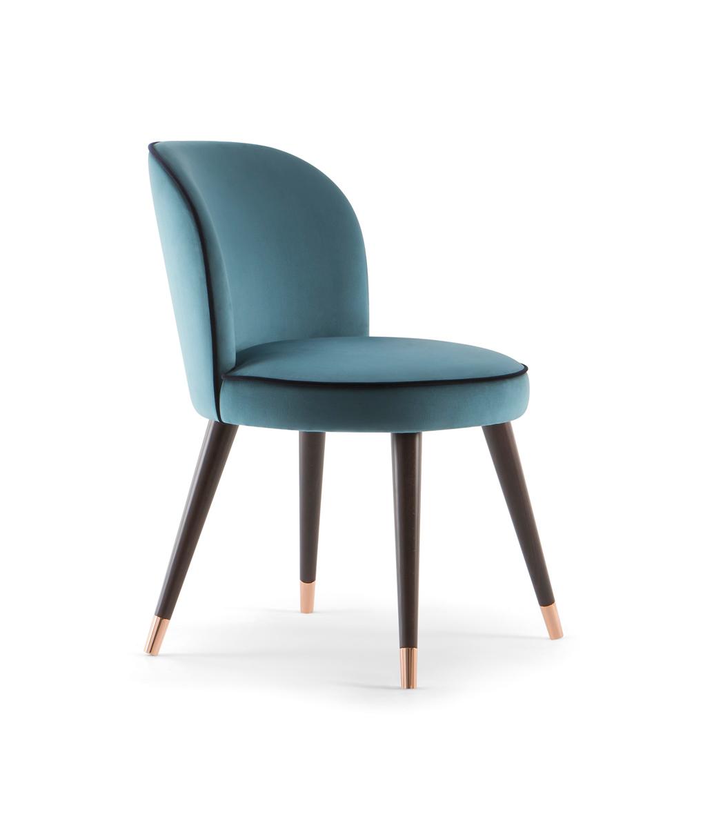 Chair, solid timber legs with optional end caps in a range of finishes including brass, copper and chrome. Upholstered in fabric, faux leather or leather.