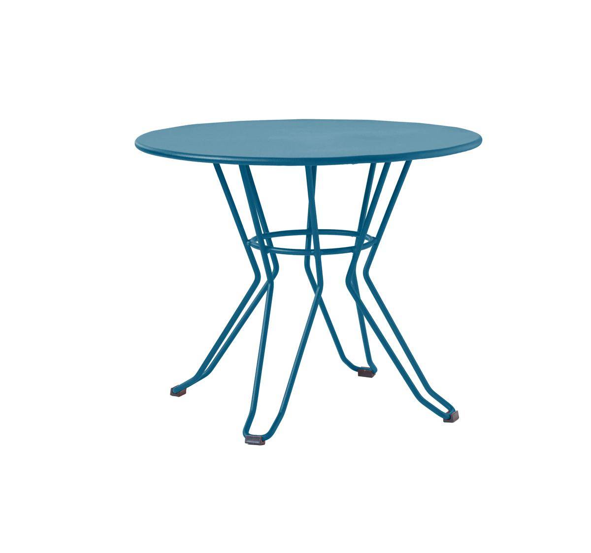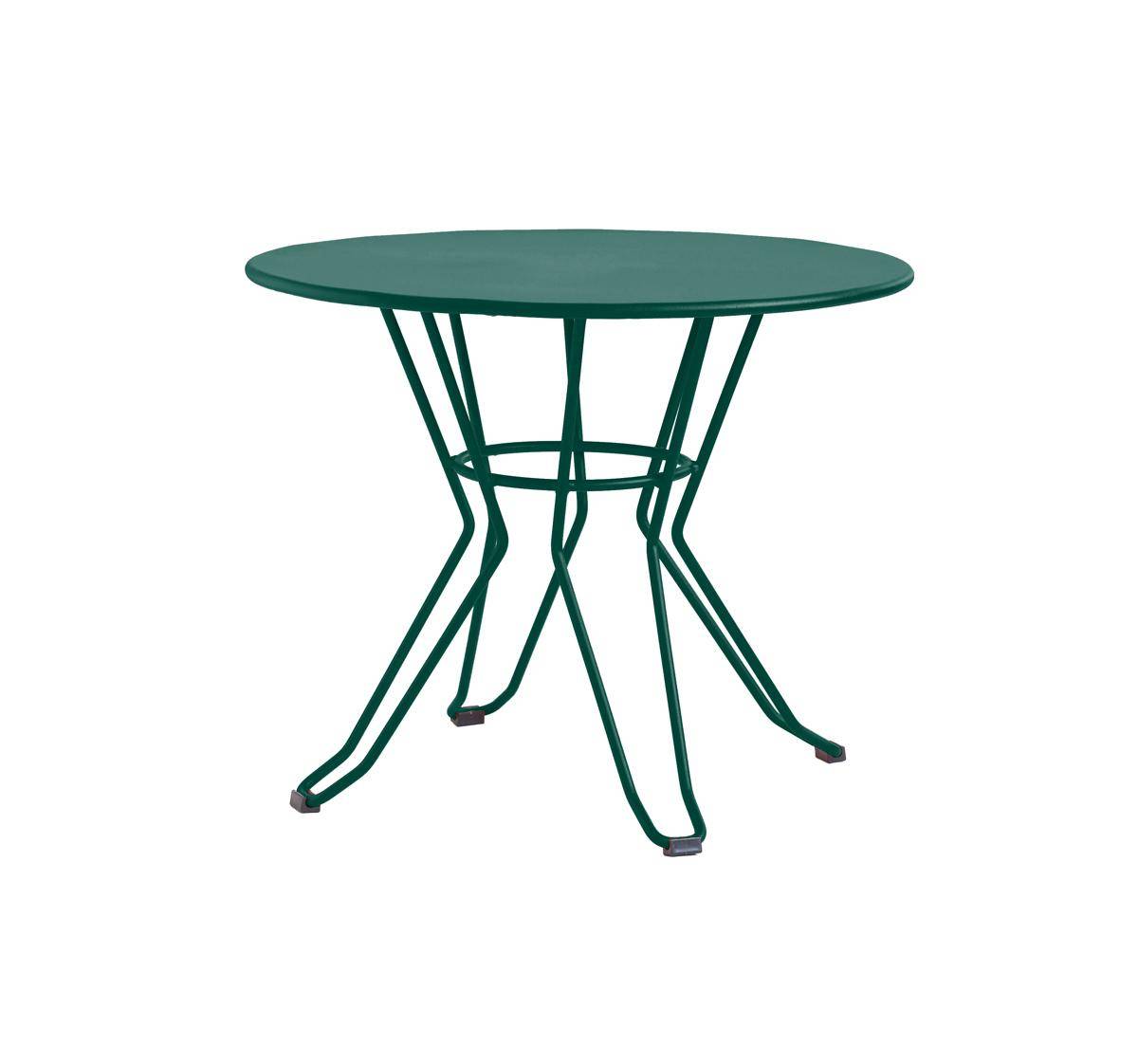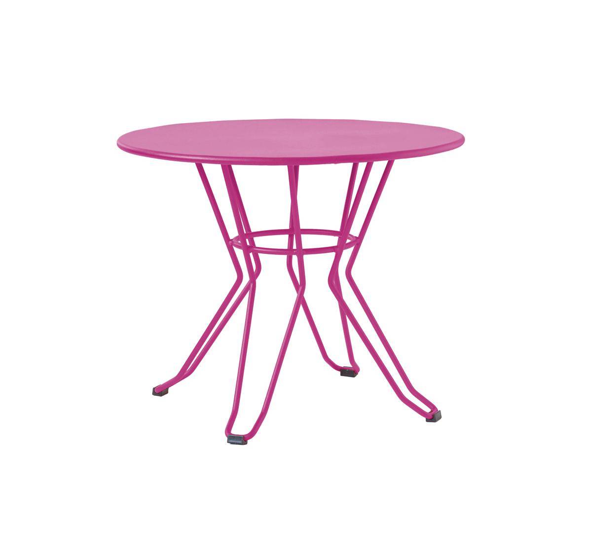 Galvanised steel rod frame coffee table with round top in metal or HPL.