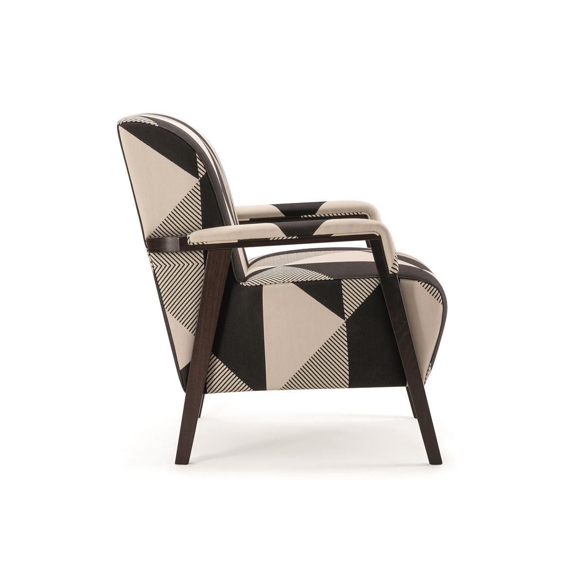 Generously sized lounge armchair with wood frame. Fully upholstered.