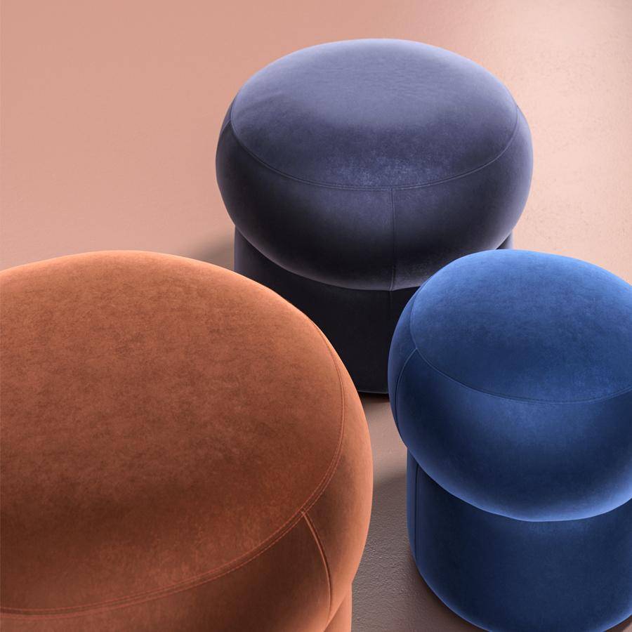 Pouf with plywood structure, fully upholsted in fabric, leather or faux leather.