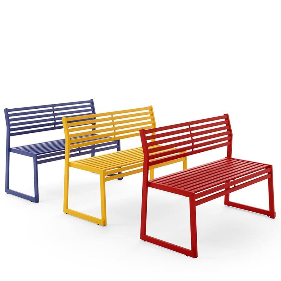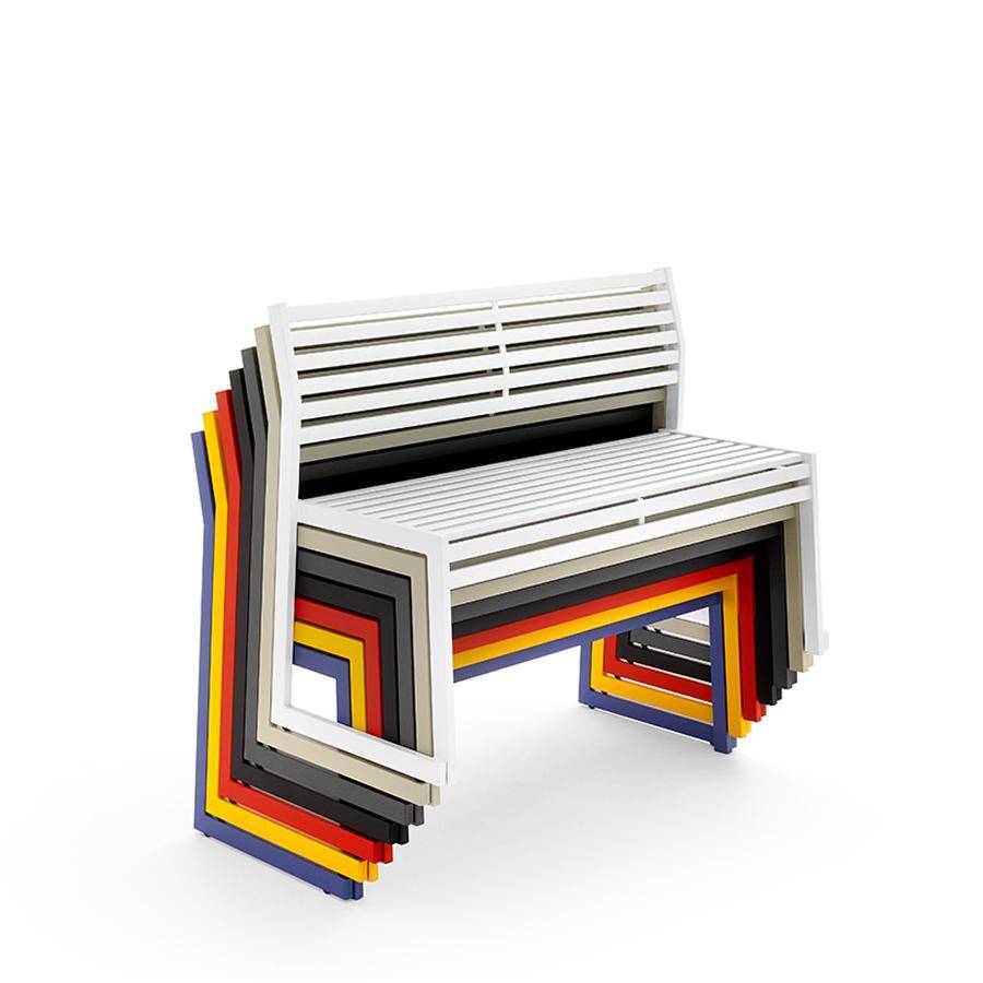 Bench with backrest, available in a range of colour finishes. Option to fix to ground using metal plates. Stackable and suitable for exterior use.