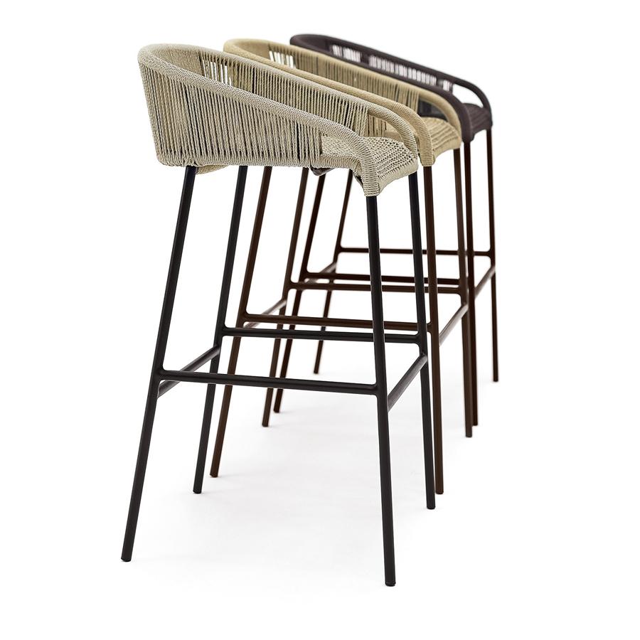 Stool with with painted aluminium frame and natural, dark brown or hemp woven seat and back. Available in two heights. Suitable for exterior use.