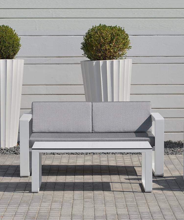 Coffee table with aluminum structure and HPL top, available in a range of finishes. Suitable for exterior use.