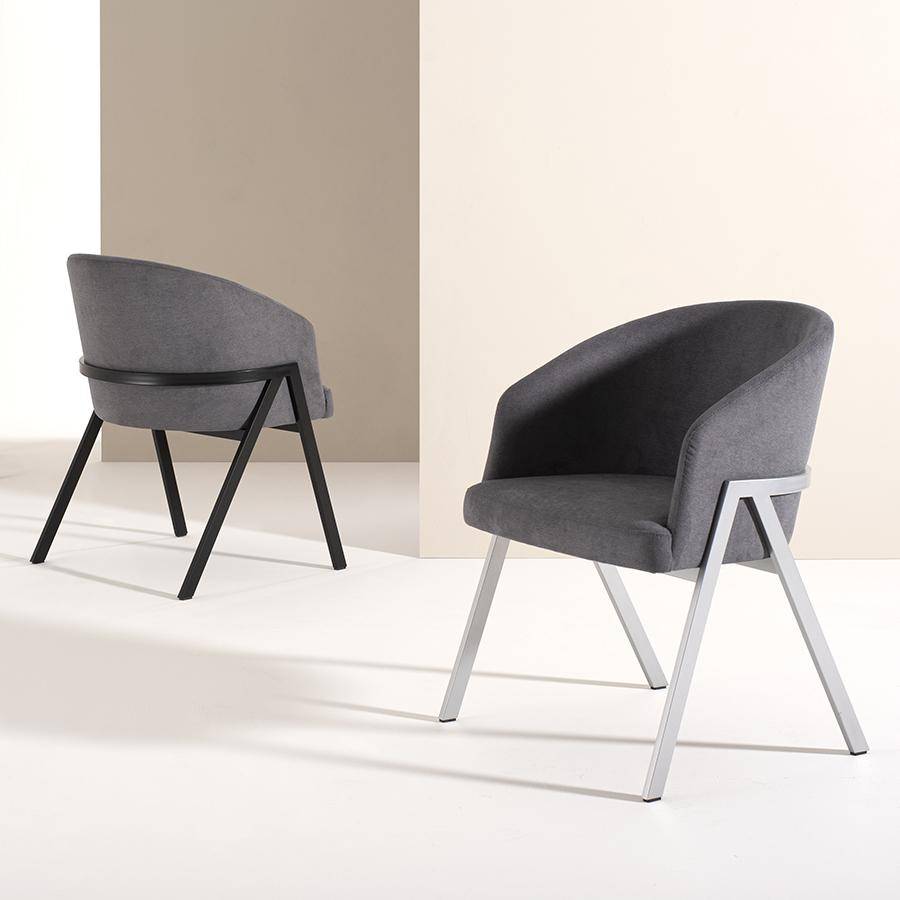 Modern armchair with metal frame that wraps around the curved backrest. Fully upholstered.