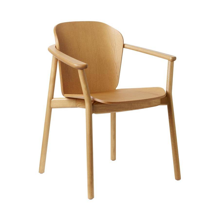 Nordic style armchair with solid wood frame and curved wood backrest.