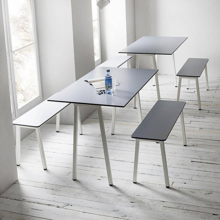 Bench table with metal painted frame and compact laminate top. Suitable for exterior use. Available with matching bench to complete the set.