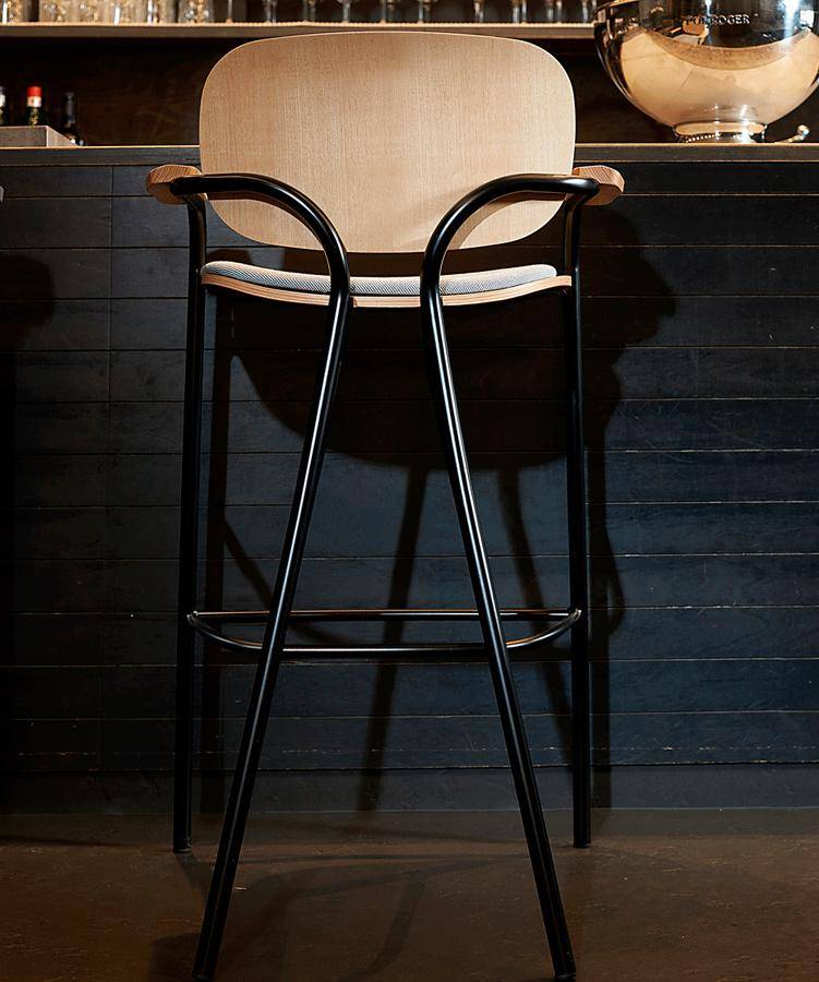 Bar stool with wooden back rest, upholstered seat and metal tubular frame.