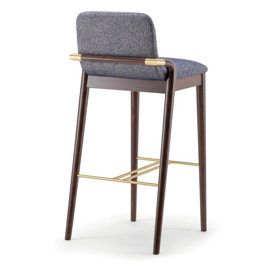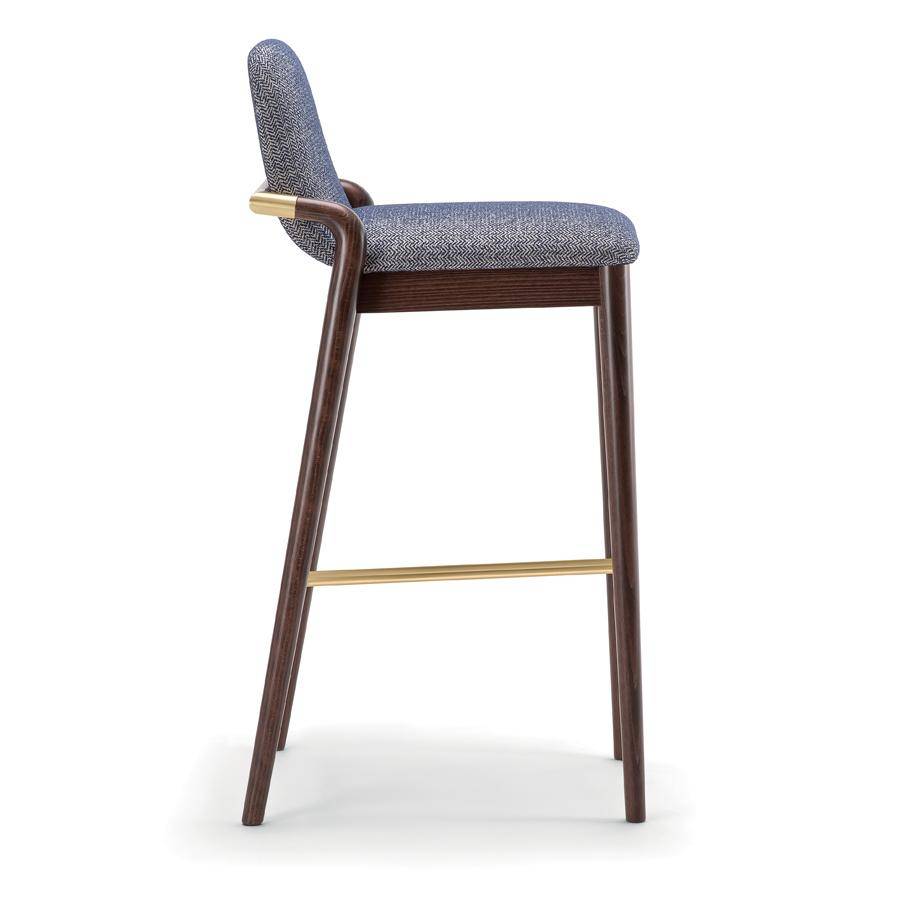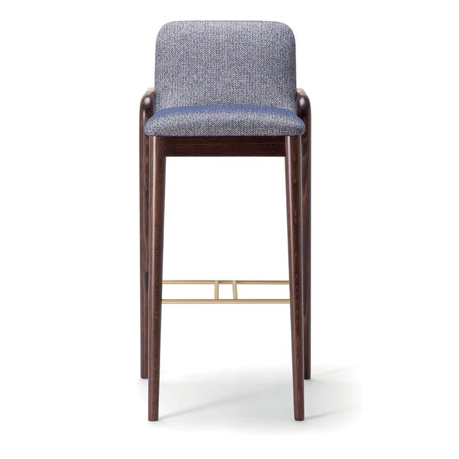 Barstool with solid wood frame, available in a range of finishes with stylish arm detail. Footrest to match. Upholstered seat and back in fabric, leather or faux leather.