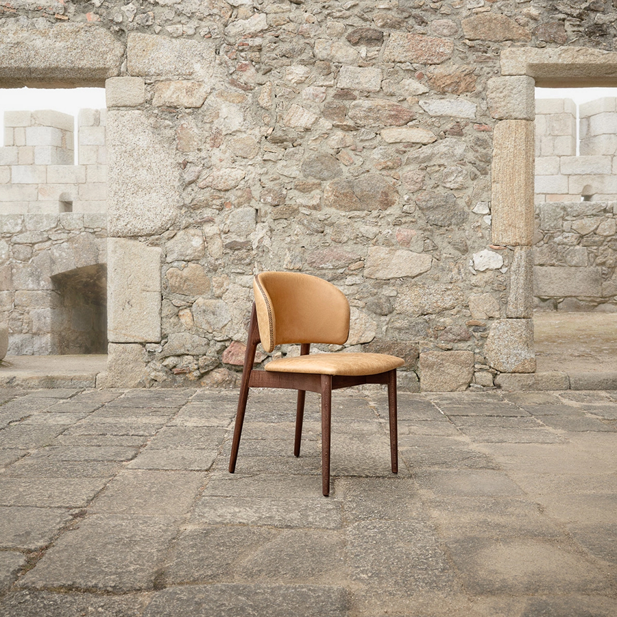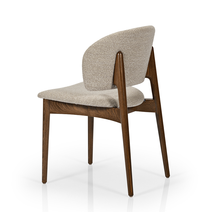 Contemporary side chair with wood frame. Upholstered seat and back with inviting curve detail.