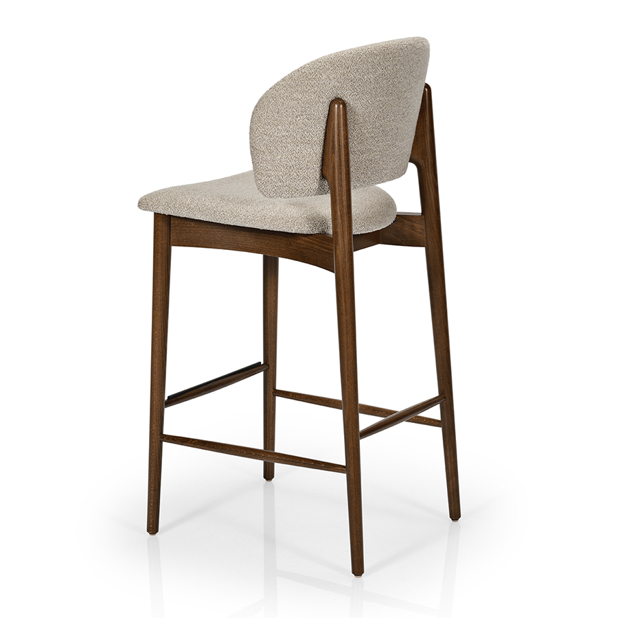 Contemporary barstool with wood frame and black painted iron footrest. Upholstered seat and back with inviting curve detail.