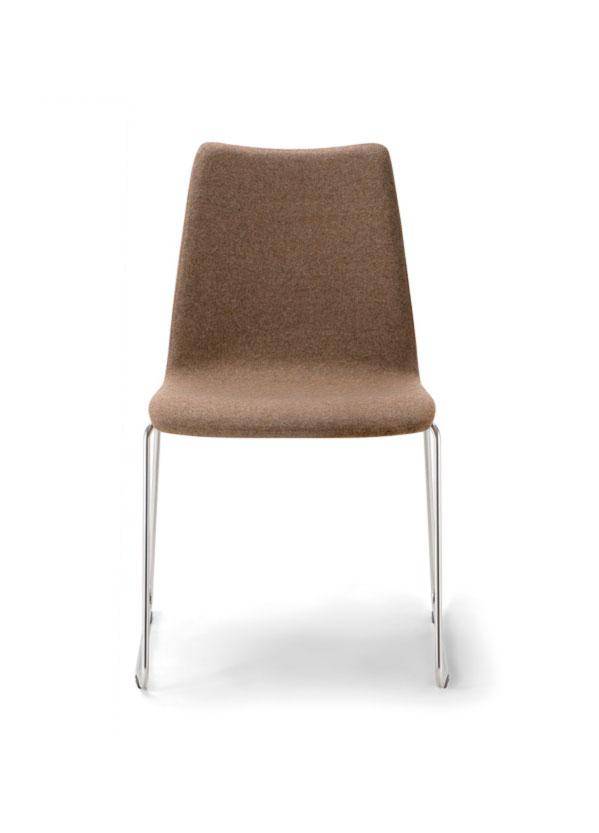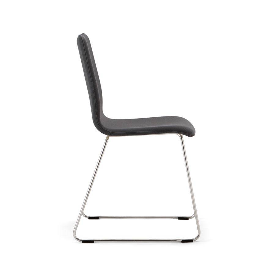 Side chair with stainless steel sled base frame. Fully upholstered shell with metal sub frame.