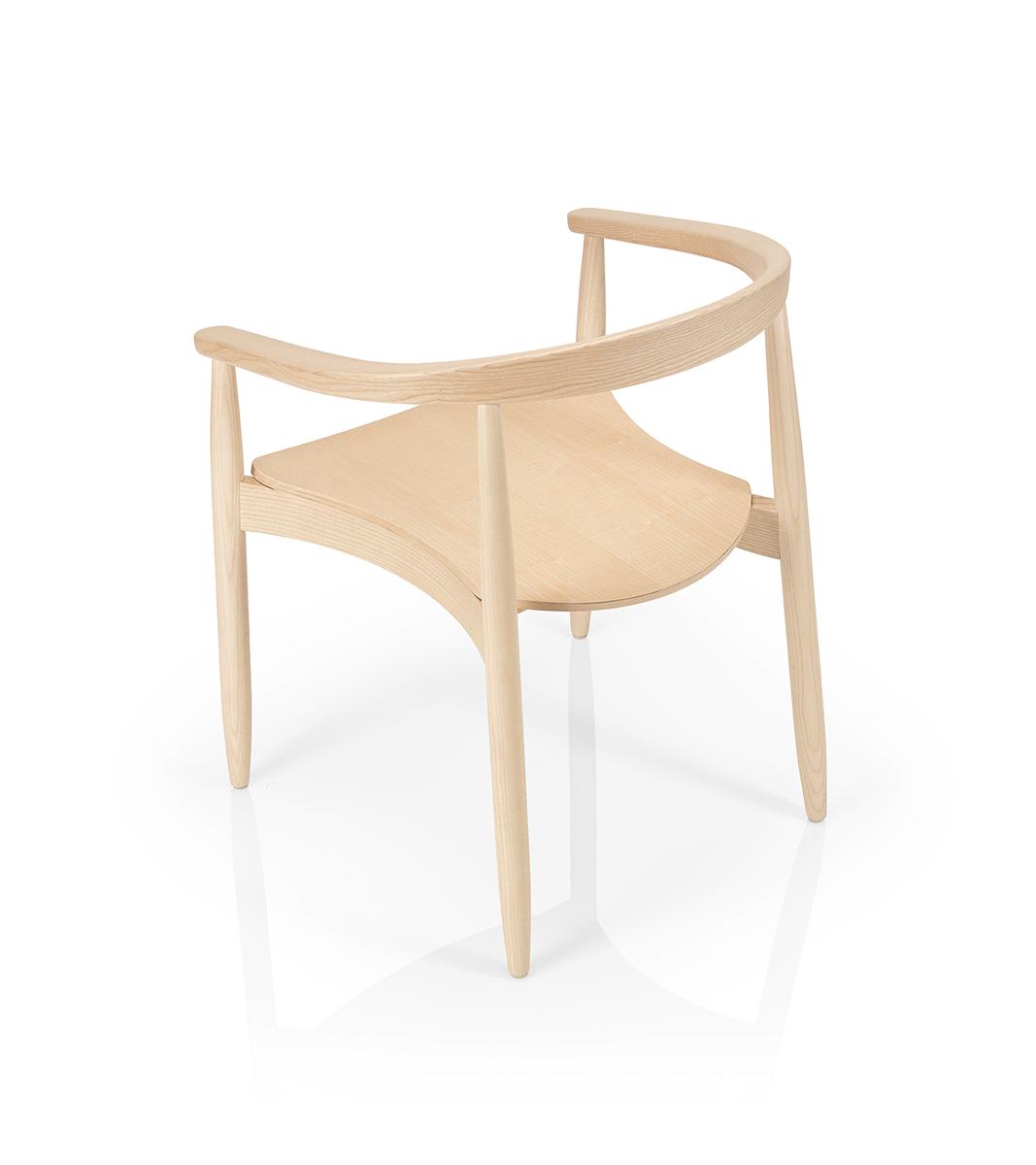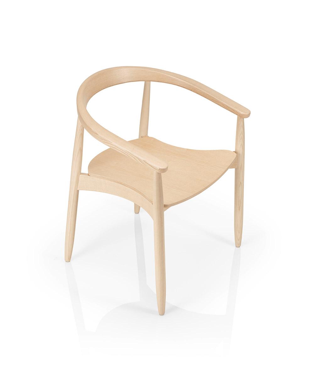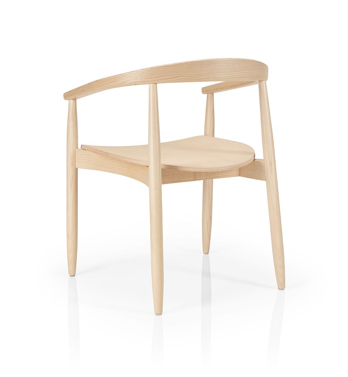 Armchair made from solid beech wood with tapered legs and curved armrest with exposed wood. Wooden seat.