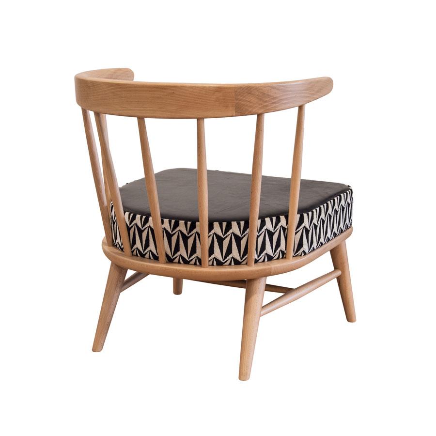 Chair, solid spindle beech back with upholstered seat in fabric, leather or faux leather.