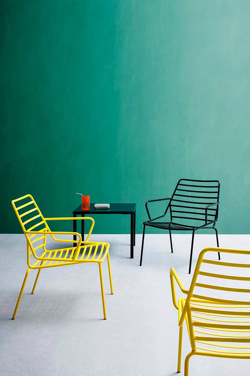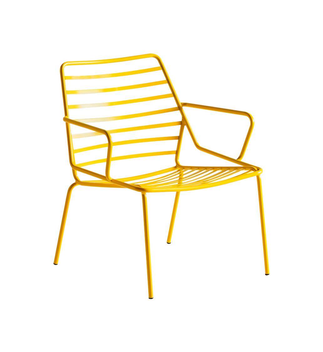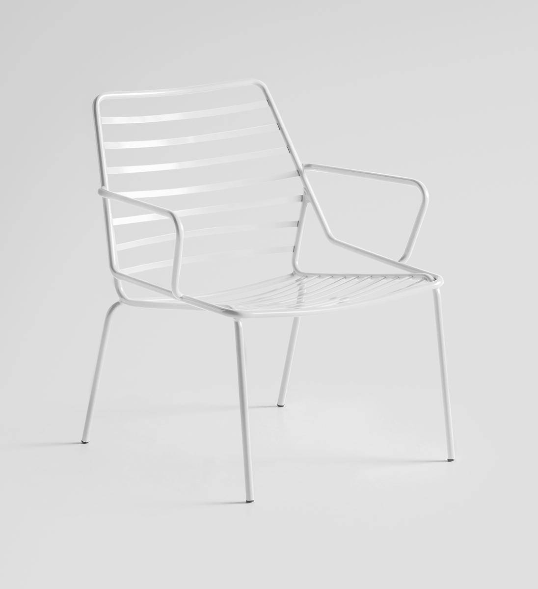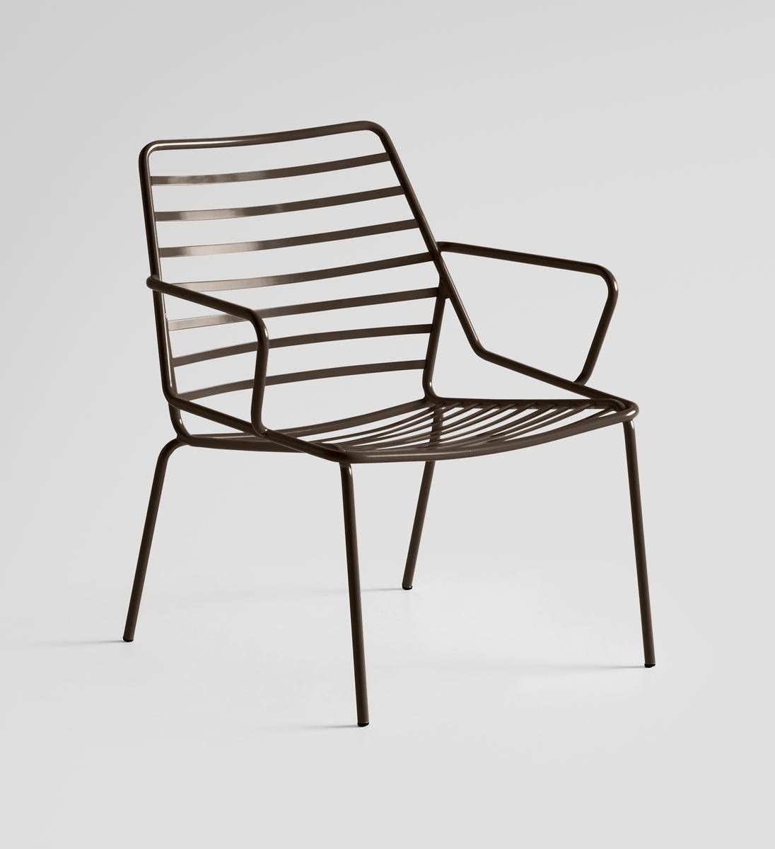 Lounge chair with slatted metal frame and armrests. Suitable for outdoor use.