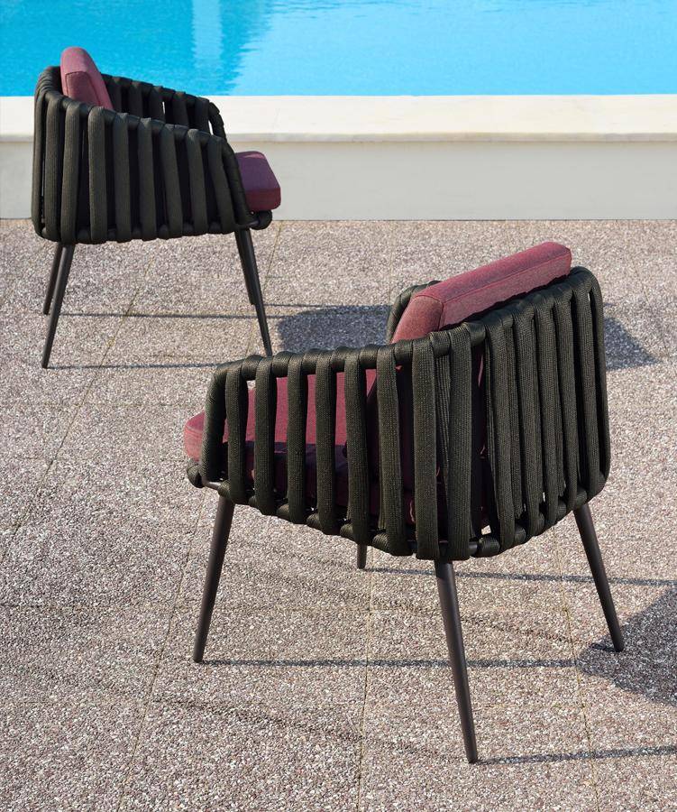 Dining armchair with aluminum structure, available in a range of finishes. Covered in cord with upholstered seat and back cushions in waterproof fabric. Suitable for exterior use.