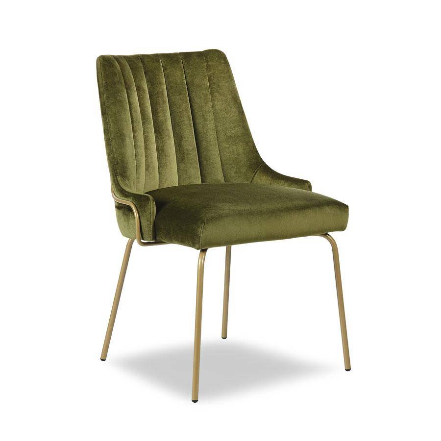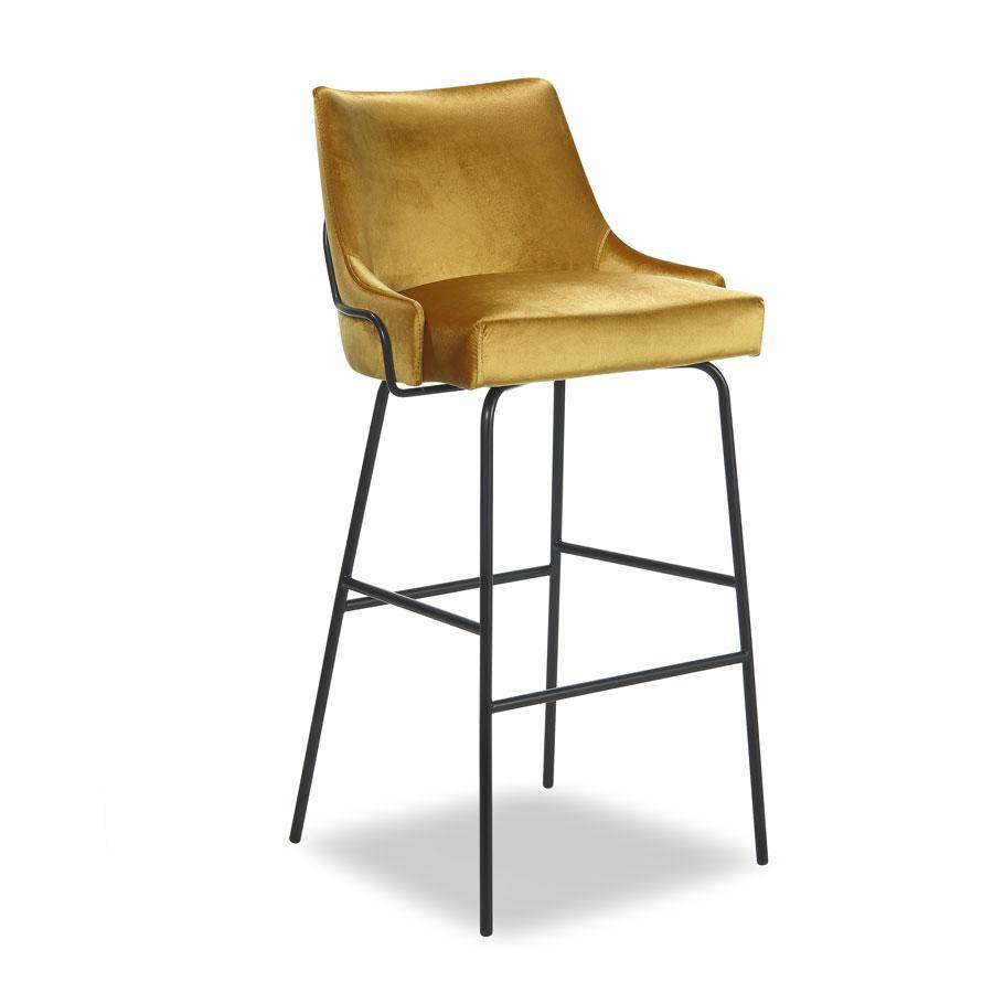 Bar stool, flute style upholstered with stylish seams on back in fabric, leather or faux leather. Metal frame available in chrome or powder coated finish.