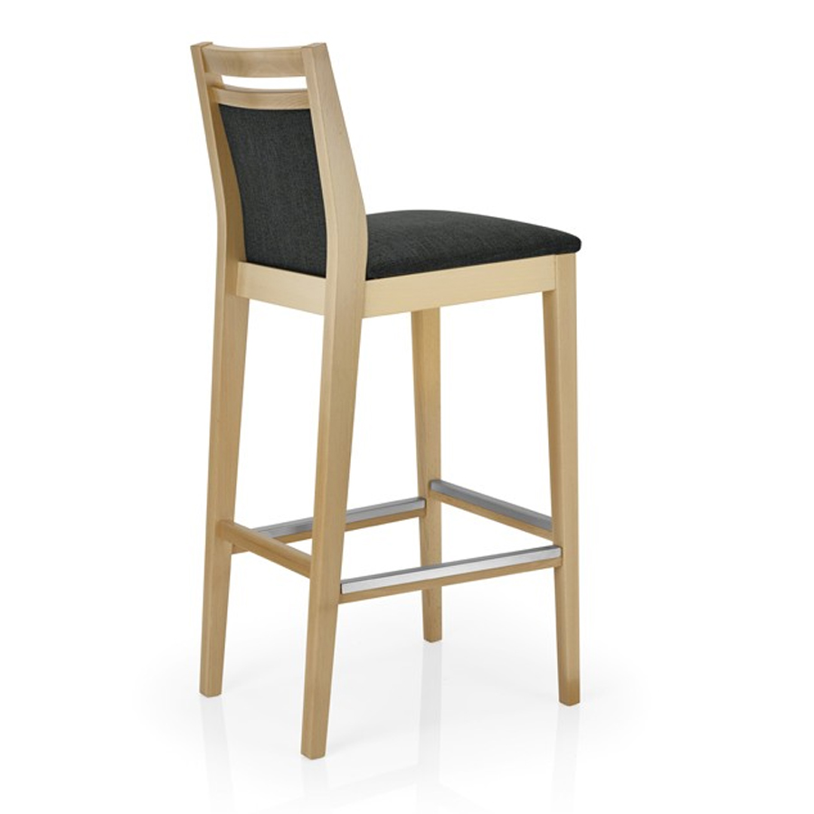 Barstool made from solid beech wood. Metal footrest. Upholstered seat and back.
