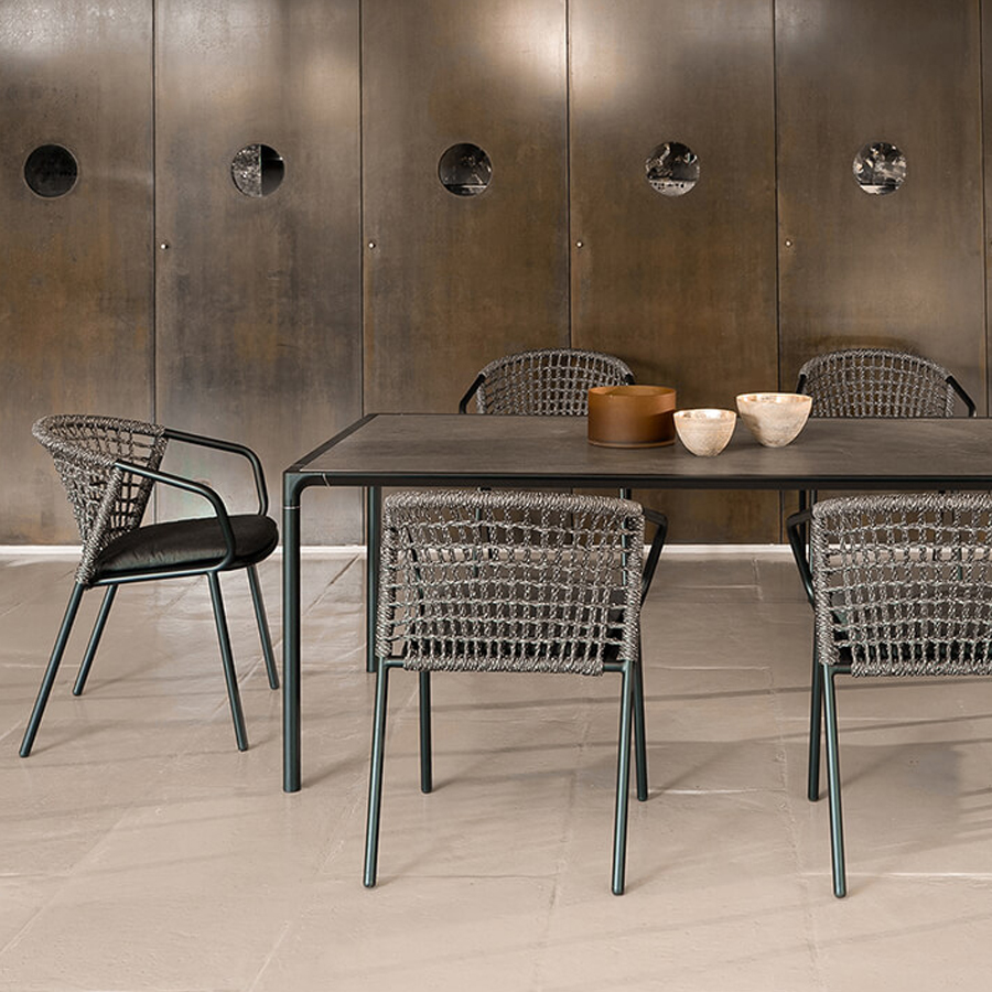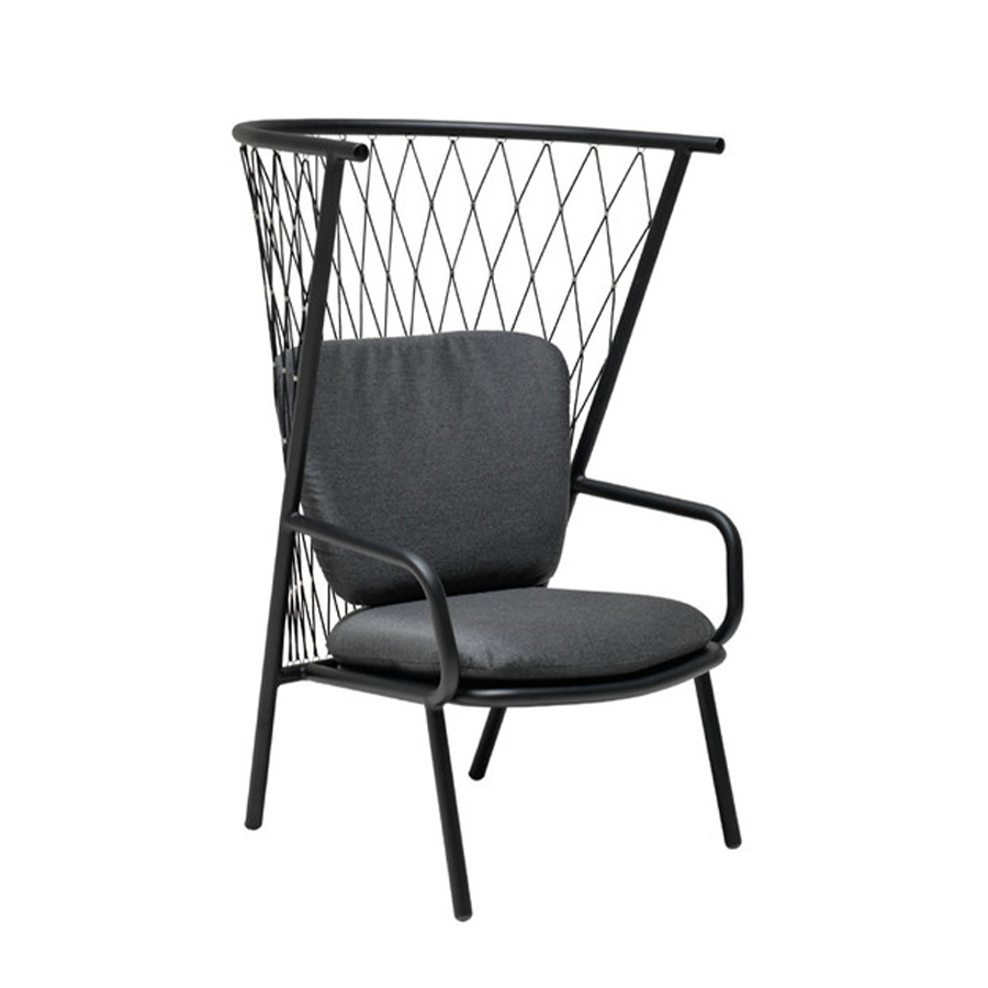 Armchair featuring an aluminum frame and handwoven synthetic rope backrest. Designed for outdoor use.