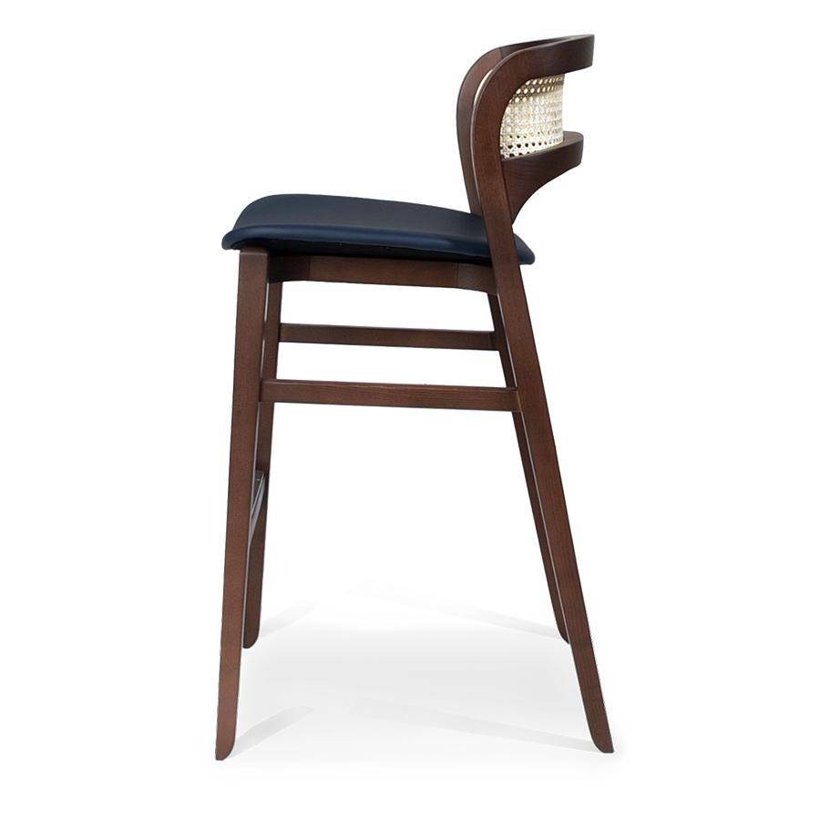 Barstool with ash wood frame, available in a range of finishes. Upholstered seat in fabric, leather or faux leather. Rattan backrest.