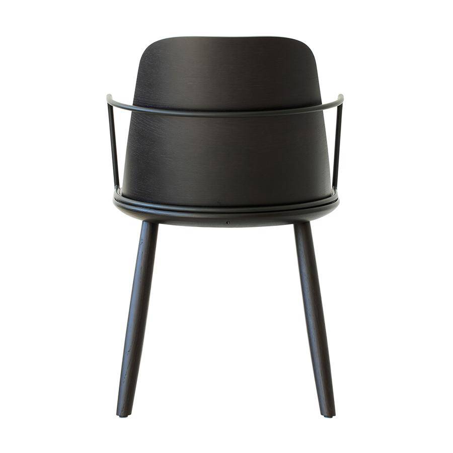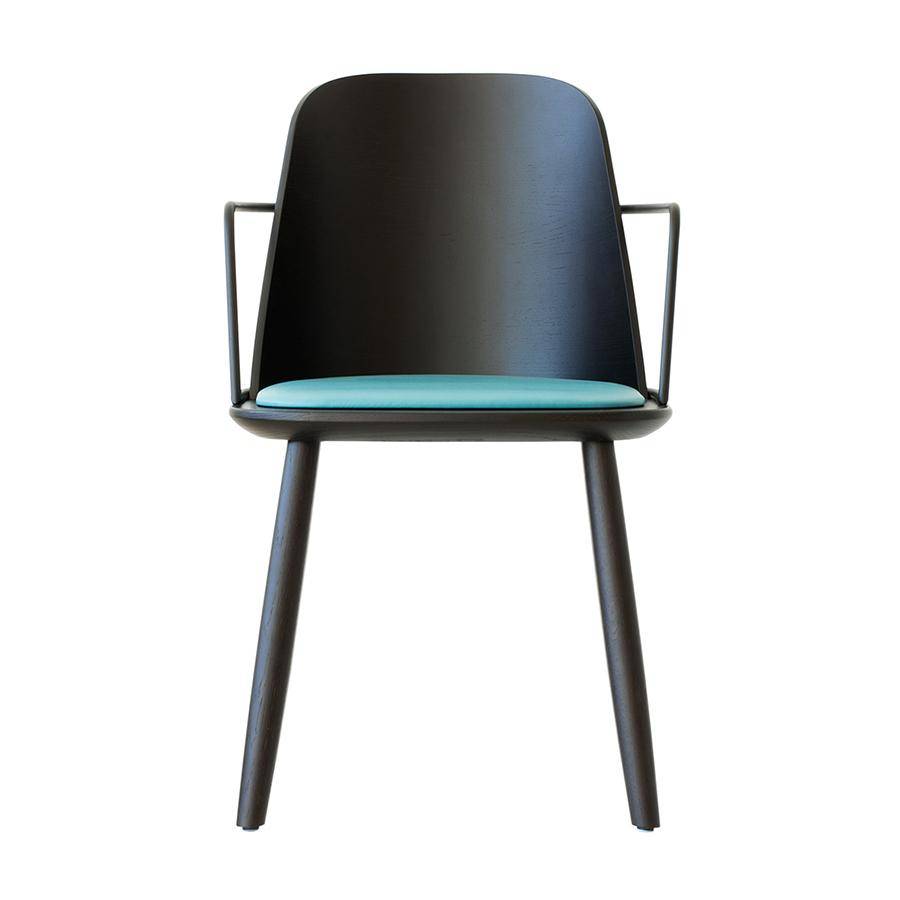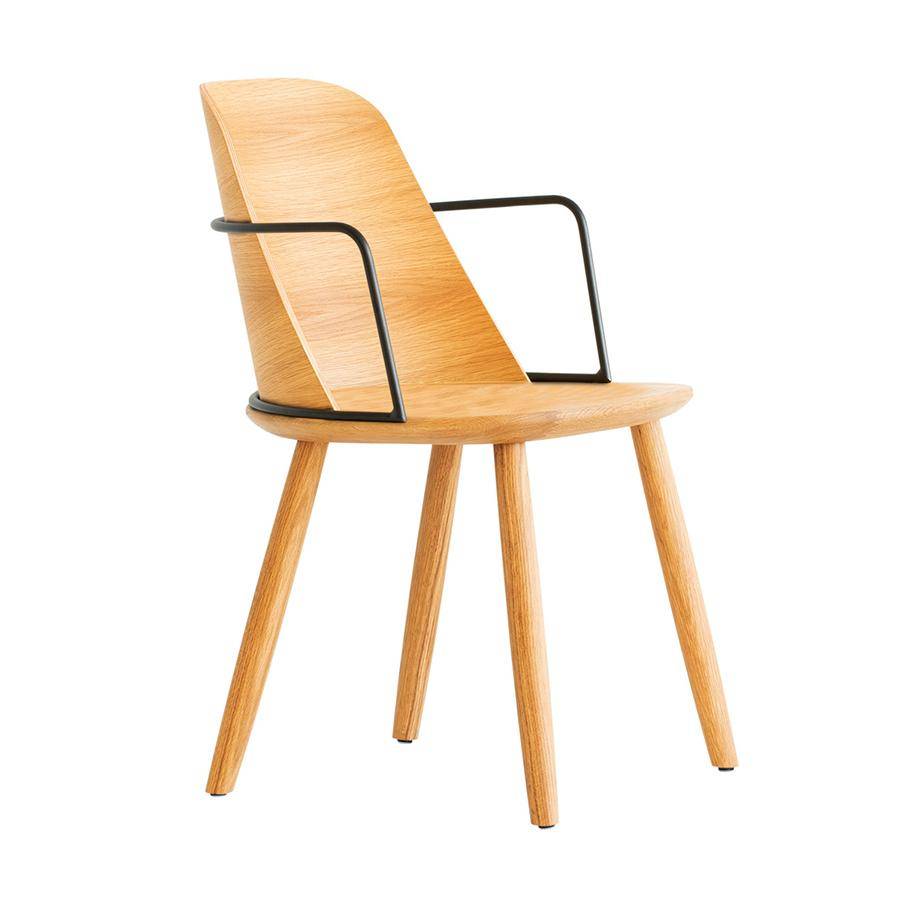 Armchair with ash wood frame, metal armrest and curved back rest. Upholstered seat pad.