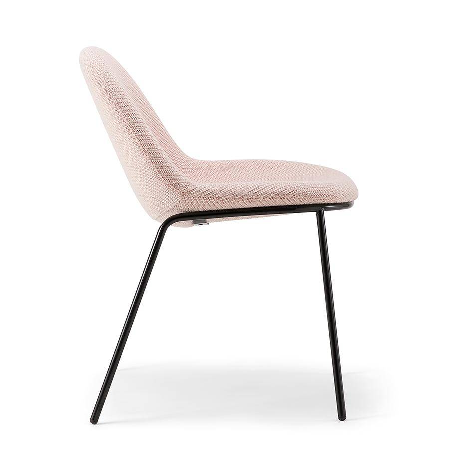 Chair with tubular metal frame, available in a range of finishes. Curved shell fully upholstered in fabric, leather or faux leather.