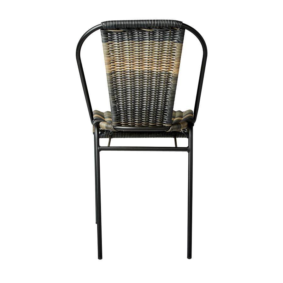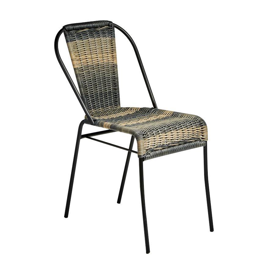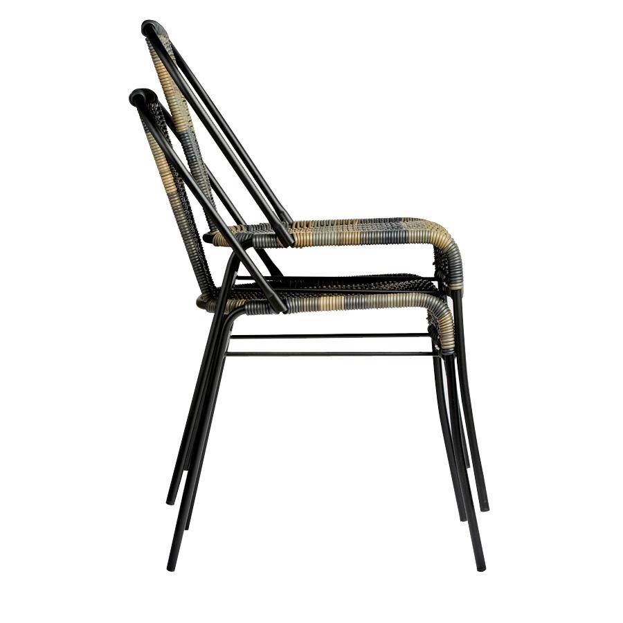 Chair with steel frame and woven seat and back rest. Stackable and suitable for exterior use.