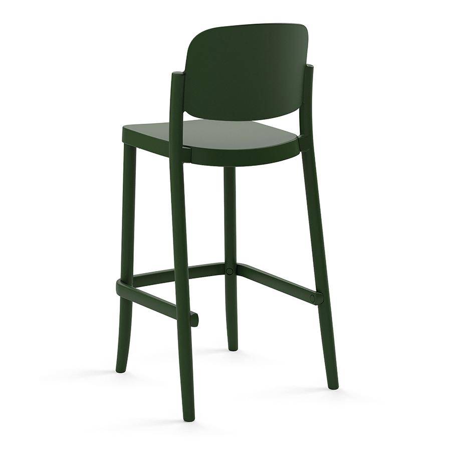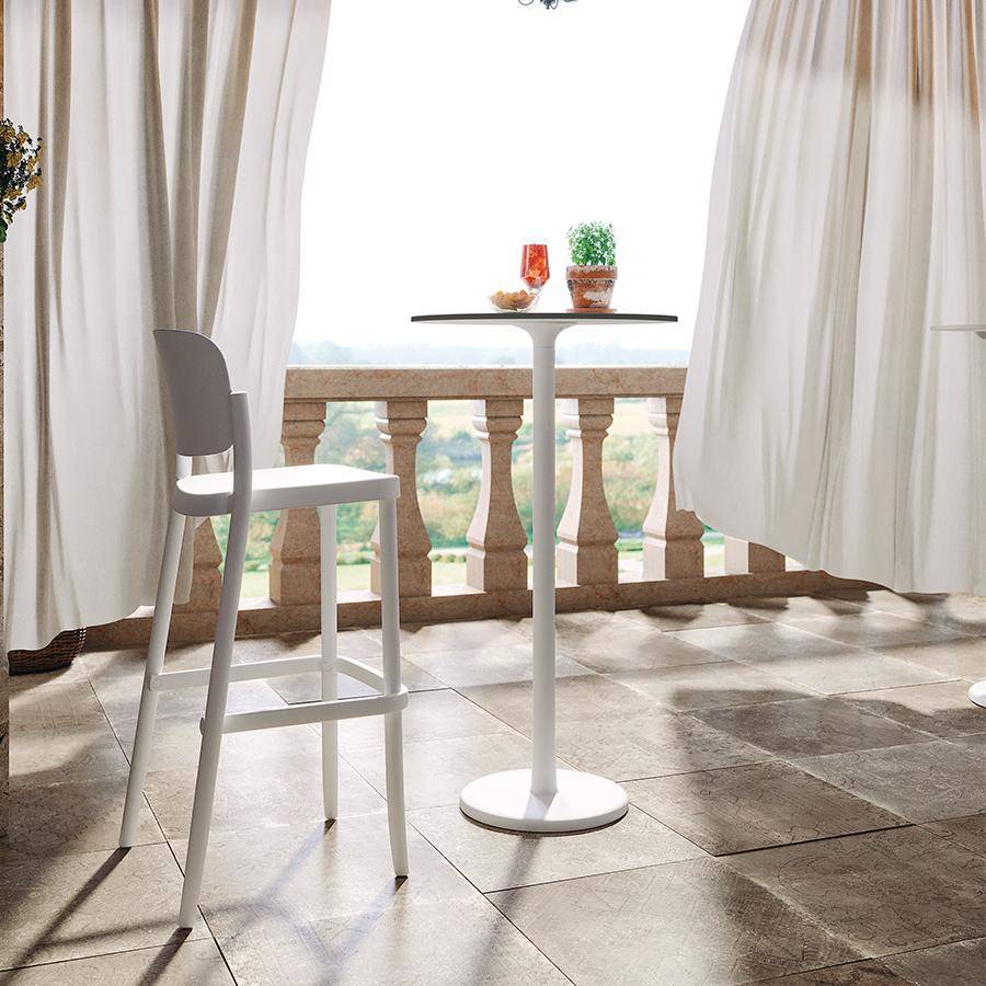 Barstool made from polypropylene with curved backrest. Stackable and suitable for both indoor and outdoor use.