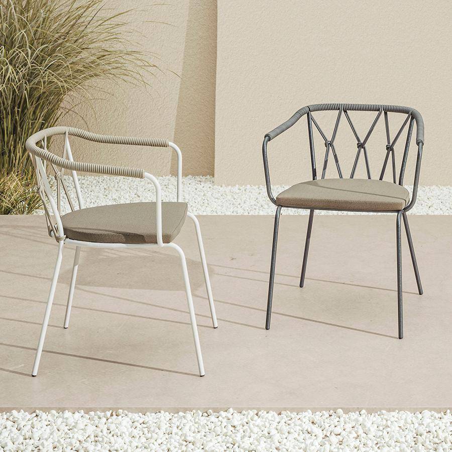 Outdoor armchair with painted steel frame, polypropylene rope and upholstered seat cushion.