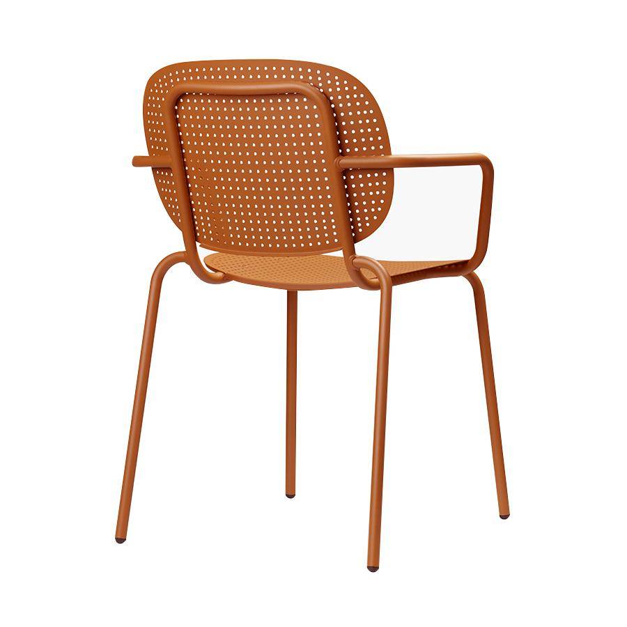 Armchair with 20mm dia zinc and polyester powder coated tubular steel frame. Dot pattern on seat and backrest. Stackable and suitable for exterior use.