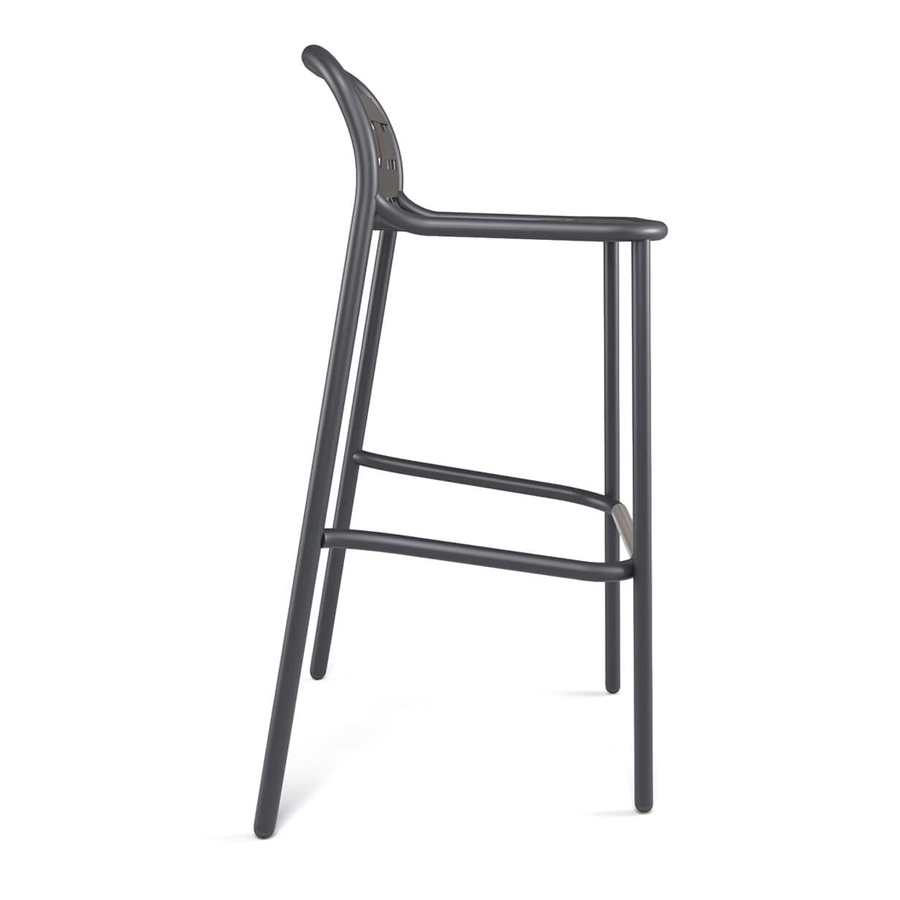Exterior stackable barstool with aluminium frame, elastic fabric seat and back.
